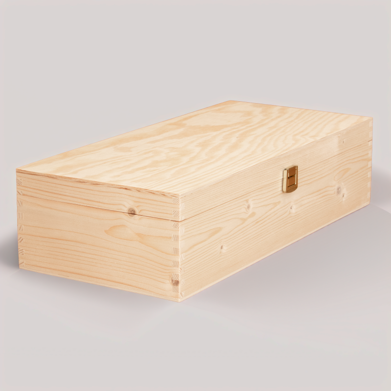 Hochwertige Holzkassette zur stilvollen Präsentation und als Geschenkverpackung für zwei Weinflaschen – ideal für Verkauf, Kundengeschenke und Events.
